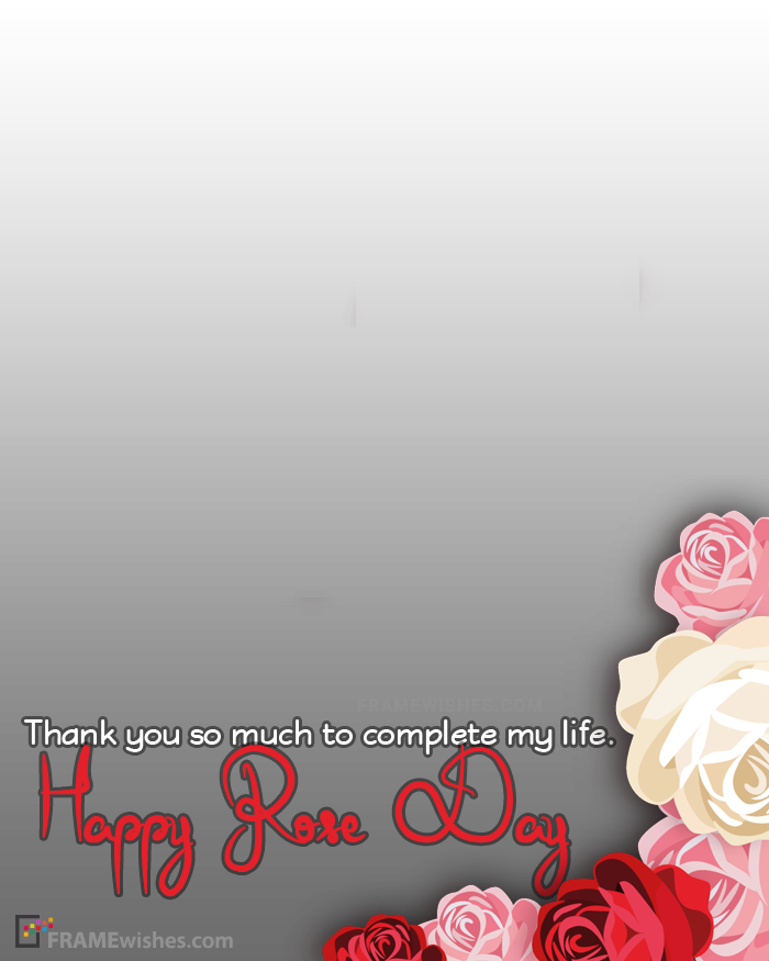 Bordered photo frame designed for happy rose day with a beautiful thank note "Thank you so much to complete my life. Happy Rose Day!". Generate now and send to your spouse or lover and express your love.