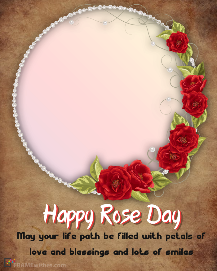 New happy rose day photo frame card for couples with beautifull roses and a lovely wish which is "May your life path be filled with petals of love and blessings and lots of smiles. Happy Rose Day".