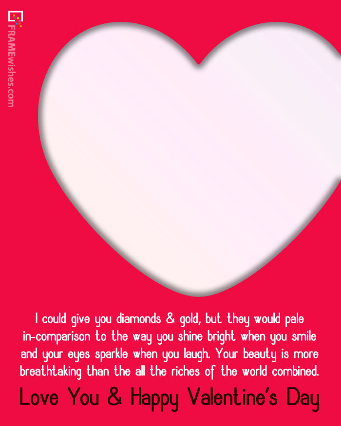 Try wish valentines day photo frame, as it has a photo frame as well as a wish with nice lines which is "I could give you diamonds & gold, but they would pale in-comparison to the way you shine bright when you smile and your eyes sparkle when you laugh. Your beauty is more breathtaking than the all the riches of the world combined. Love You & Happy Valentine’s Day". Check all valentine's day photo frames.